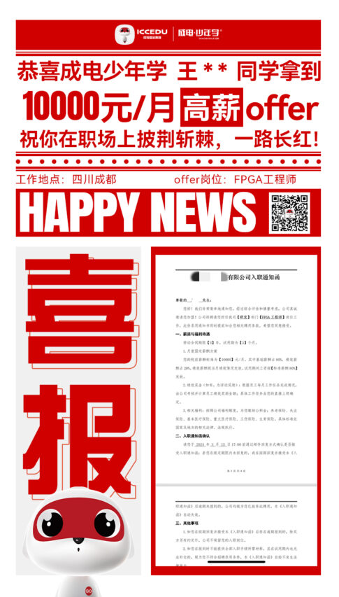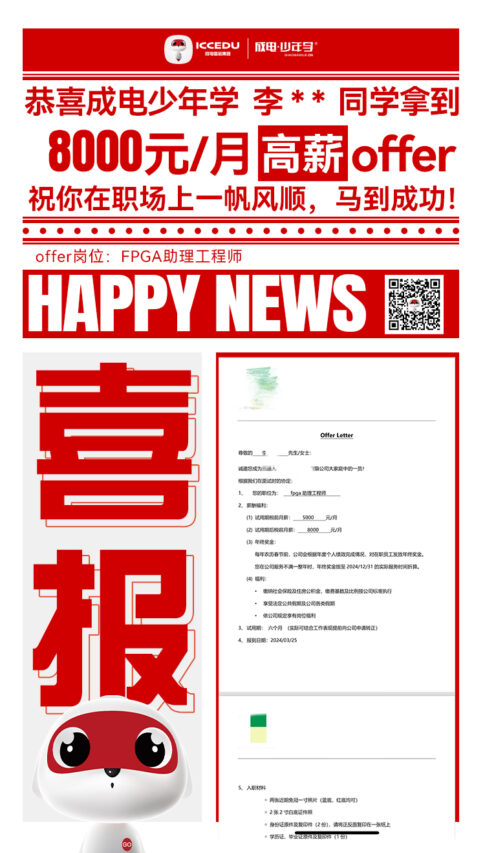 成电国芯FPGA人才基地持续在FPGA领域发力,着力打造人才培训的高地。基地专门为企业定制化培养FPGA高级工程师,并打造了一个在线FPGA学习平台,涵盖了FPGA的初级到高级课程。近期,从2024年3月的消息中可以看到,该基地的FPGA高薪订单进阶班学员,其中许多人成功地拿到了高薪offer。