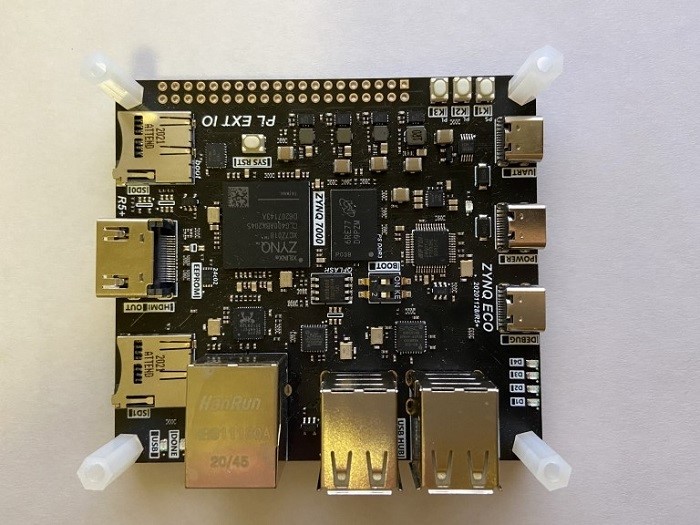 本课程使用ZYNQ ECO开发板,它以ZYNQ XC7Z010 FPGA(XC7Z010-1CLG400C)为核心,利用ZYNQ中的可编程逻辑和ARM处理器的优势可以构建强大的嵌入式系统。用户在无需设计可编程逻辑电路的情况下充分发挥Xilinx ZYNQ SoC的功能。该开发板使用Type-C的USB供电,拥有1个千兆以太网口,4个USB接口,1个SD卡槽,1个HDMI接口,可以实现非常丰富的通信、控制、信号处理等实验。除此以外,该开发板还包括3个按钮,4个LED以及32个IO扩展口,方便实现各种实验效果。