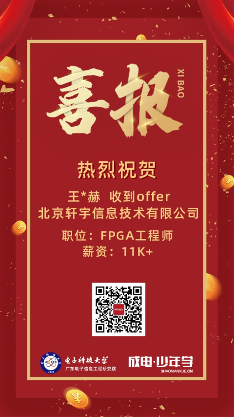 2021年FPGA精英人才培养计划已完成331人,平均就业薪资10384.33元,高出同级毕业生就业薪资52%。2022年3月重庆人文科技学院王*赫、胡*、虞*焙、程*悦等多位同学在100天的学习之后也已经拿到高薪offer。