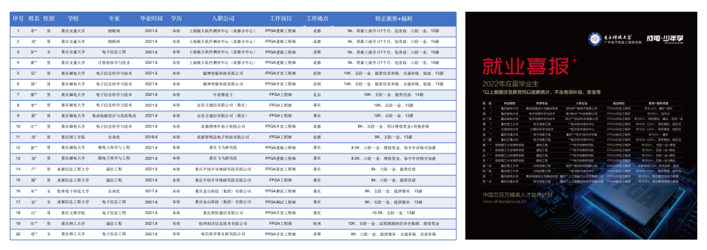 自19年来,FPGA技术讲座推广高校行完成1238场,覆盖同学32521人。2021FPGA精英人才培养计划完成331人,并成功推送到合作企业。平均就业薪资15384.33元,高出同级毕业生就业薪资52%。