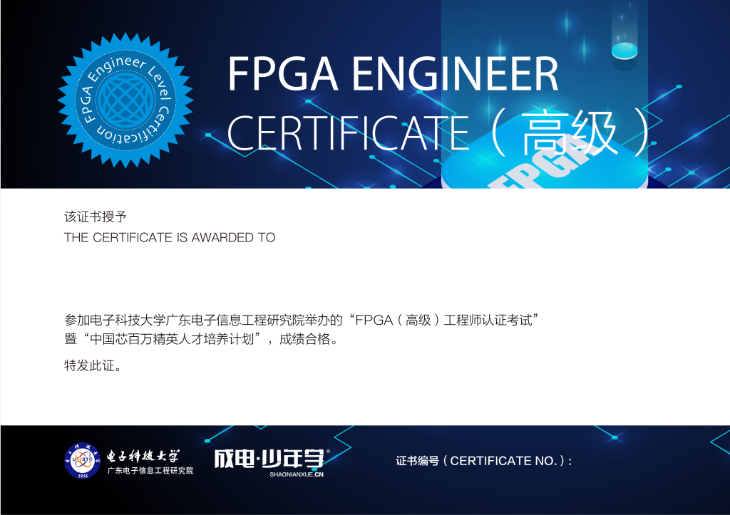 FPGA工程师证书是FPGA工程能力等级的认证。认证采用电子科技大学广东电子信息工程研究院,微电子专业人才培养体系标准,重在考察学员在FPGA软硬件设计及开发过的实际操作能力。证书严格按照行业标准进行考核,理论考试占比40%,工程操作占比60%。证书分为初级、中级、高级三个等级,其中初级认证匹配教材《xilinx FPGA入门基础指导教程》、中级认证匹配教材《xilinx FPGA中级技术指导教程》、高级认证匹配《xilinx FPGA高级技术指导教程》。